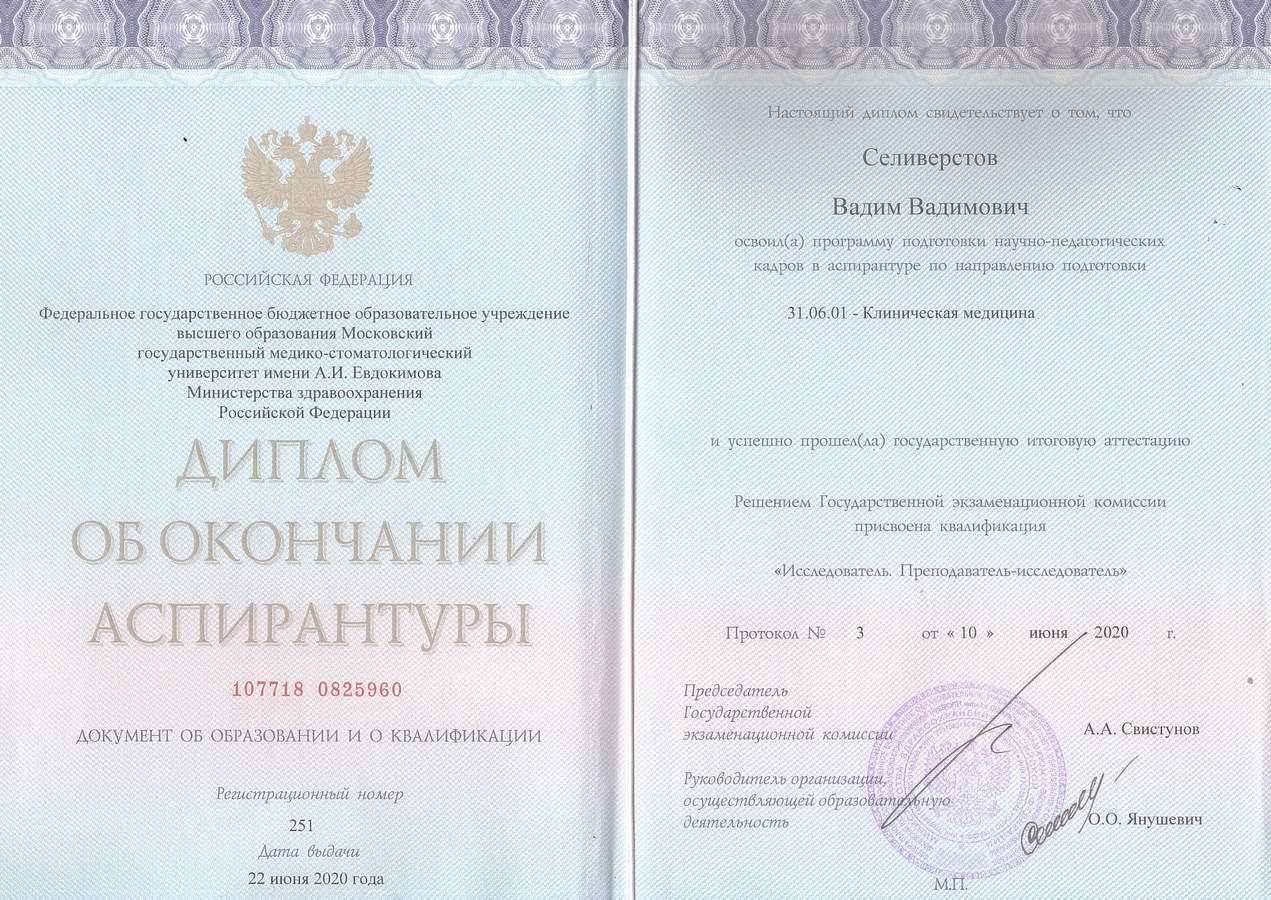 2020г. — Аспирантура, Московский государственный медико- стоматологический университет Евдокимова (стоматология)