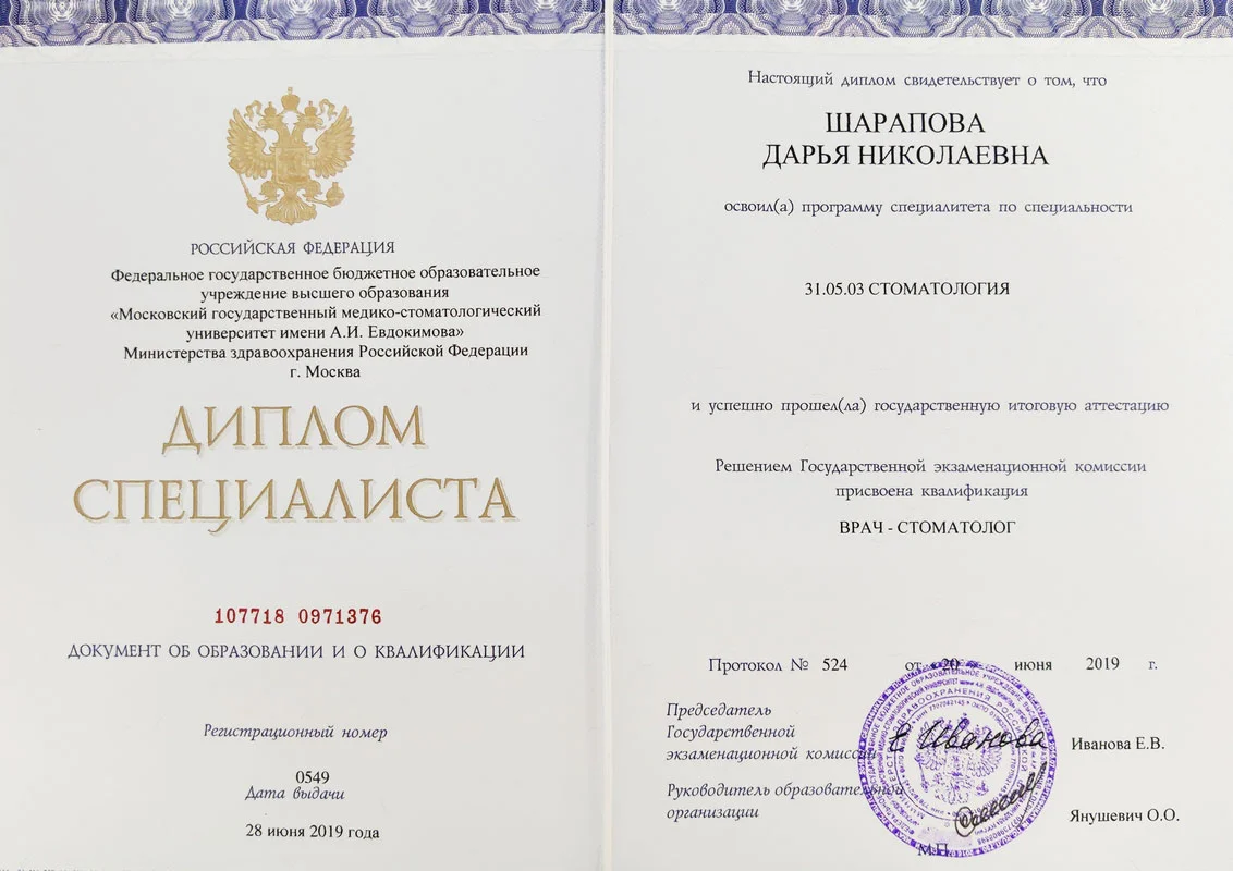 2019г. – Окончила ФГБОУ ВО «Московский государственный медико-стоматологический университет имени А.И. Евдокимова» Министерства здравоохранения Российской Федерации г. Москва. Диплом по специальности «Стоматология»