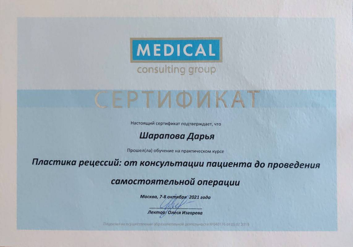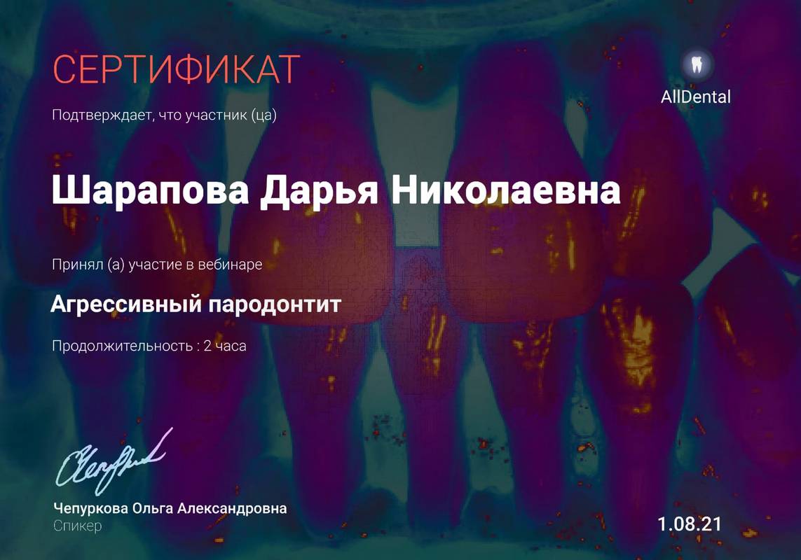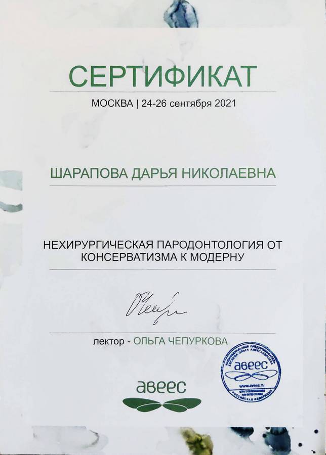 2021г. – Первичная аккредитация специалиста по специальности «Стоматология терапевтическая». Федеральное государственное бюджетное образовательное учреждение высшего образования "Московский государственный медико-стоматологический университет имени А. И. Евдокимова" Министерства здравоохранения Российской Федерации. Аккредитация действительна 5 лет.