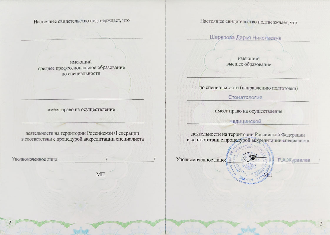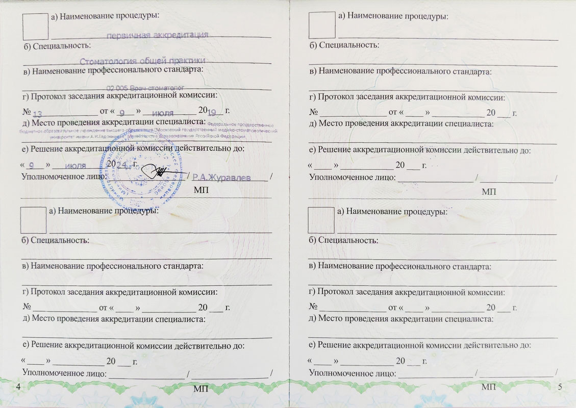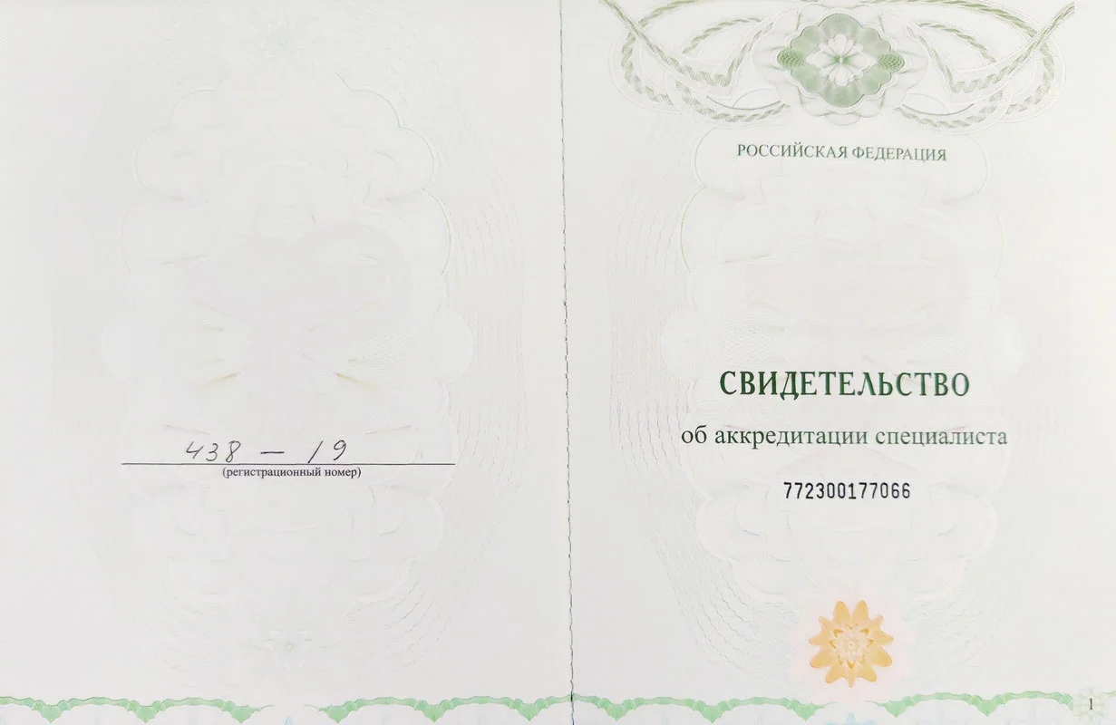 2019г. – Свидетельство об аккредитации специалиста «Стоматология общей практики» ФГБОУ ВО «Московский государственный медико-стоматологический университет имени А.И. Евдокимова» Министерства здравоохранения Российской Федерации г. Москва. Аккредитация действительна 5 лет.