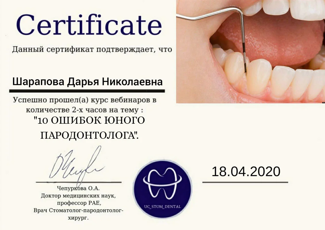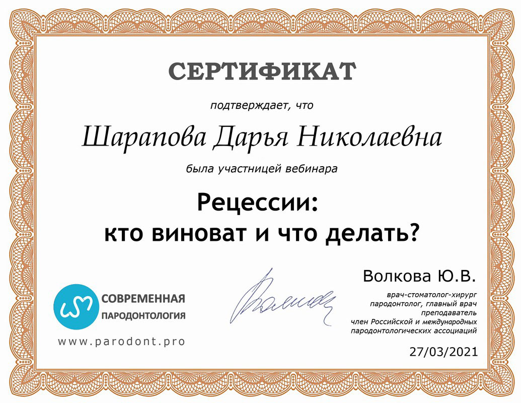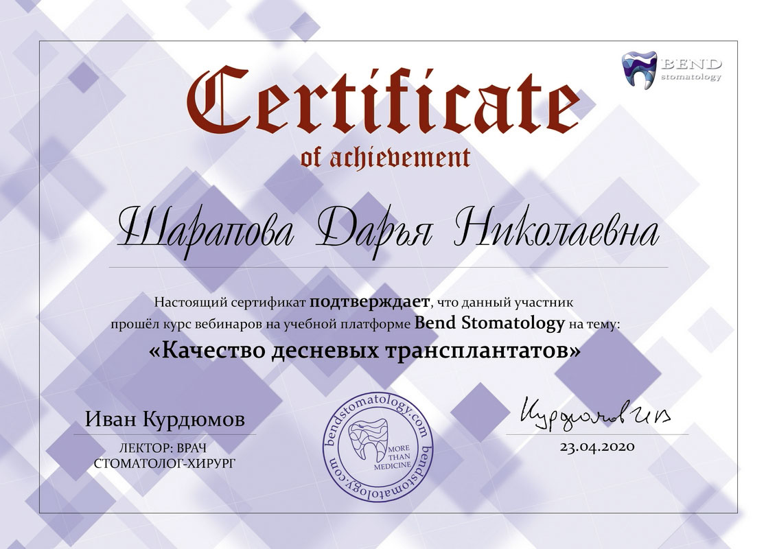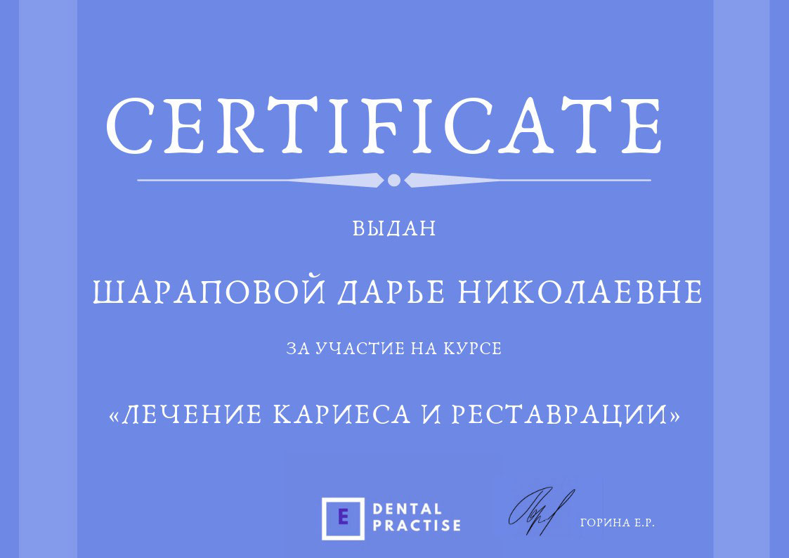 2024г. – Аккредитация специалиста по специальности «Стоматология общей практики». Федеральное государственное бюджетное образовательное учреждение дополнительного профессионального образования «Российская медицинская академия непрерывного профессионального образования» Министерства здравоохранения Российской Федерации. Аккредитация действительна 5 лет.