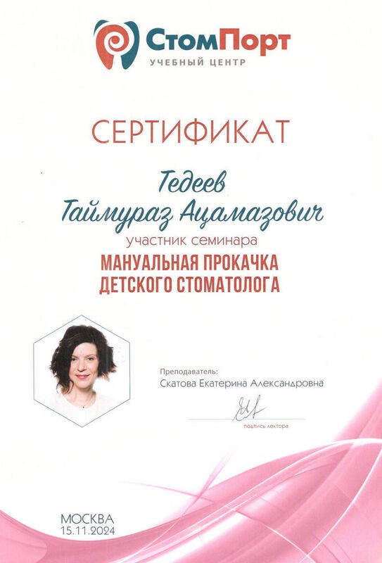 2024г. — «Мануальные прокачка детского стоматолога», преподаватель: Скатова Е.А., Москва