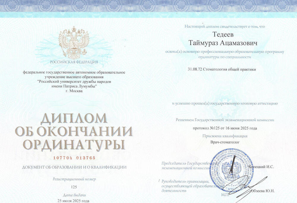 2025г. — Российский университет дружбы народов им. Патриса Лумумбы, ординатура, врач-стоматолог