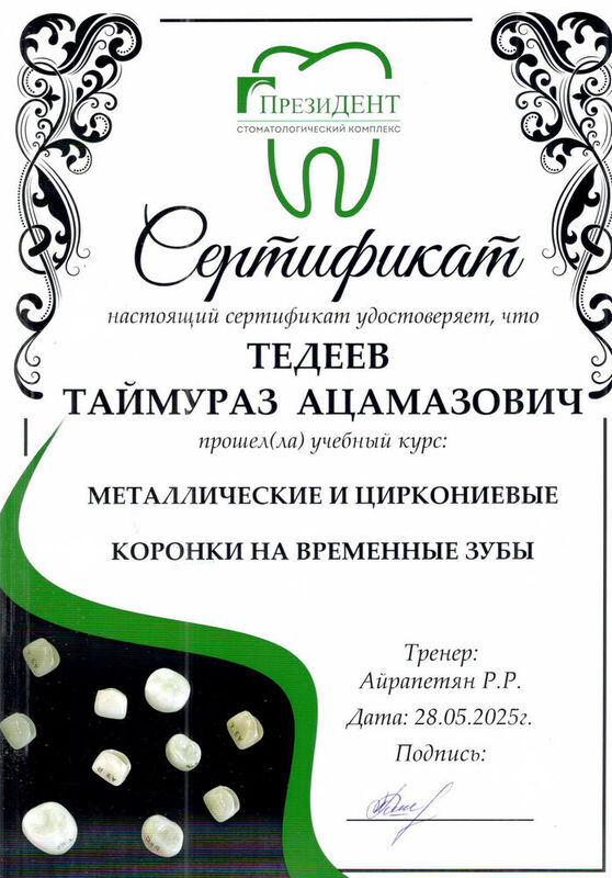2025г. — Пройден фантомный курс по детской стоматологии тренер КМН доцент Савинова Е. А. Учебный центр «ПрезиДент» «Металлические и цирконевые коронки на временные зубы», тренер: Айрапетова Р.Р., Москва