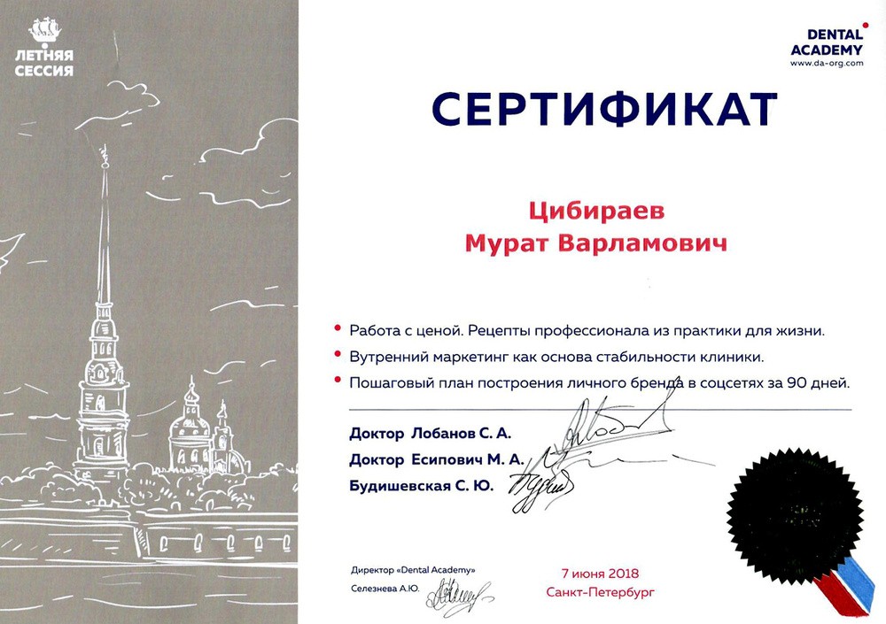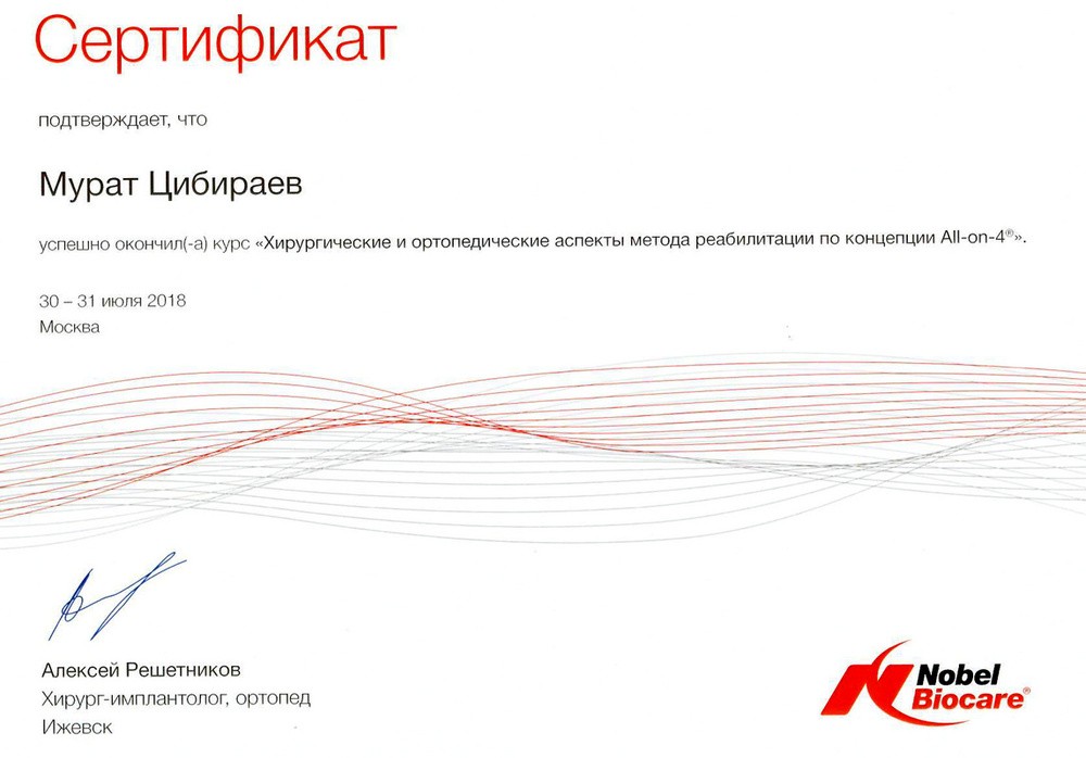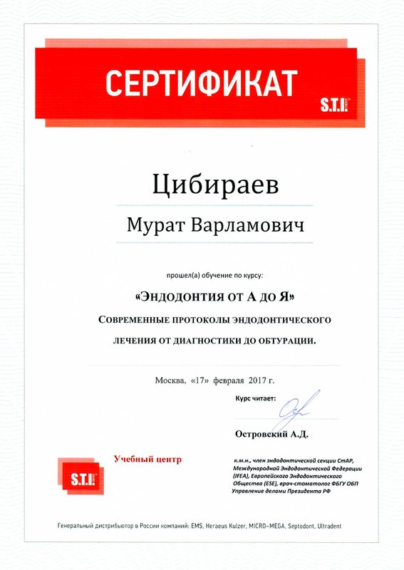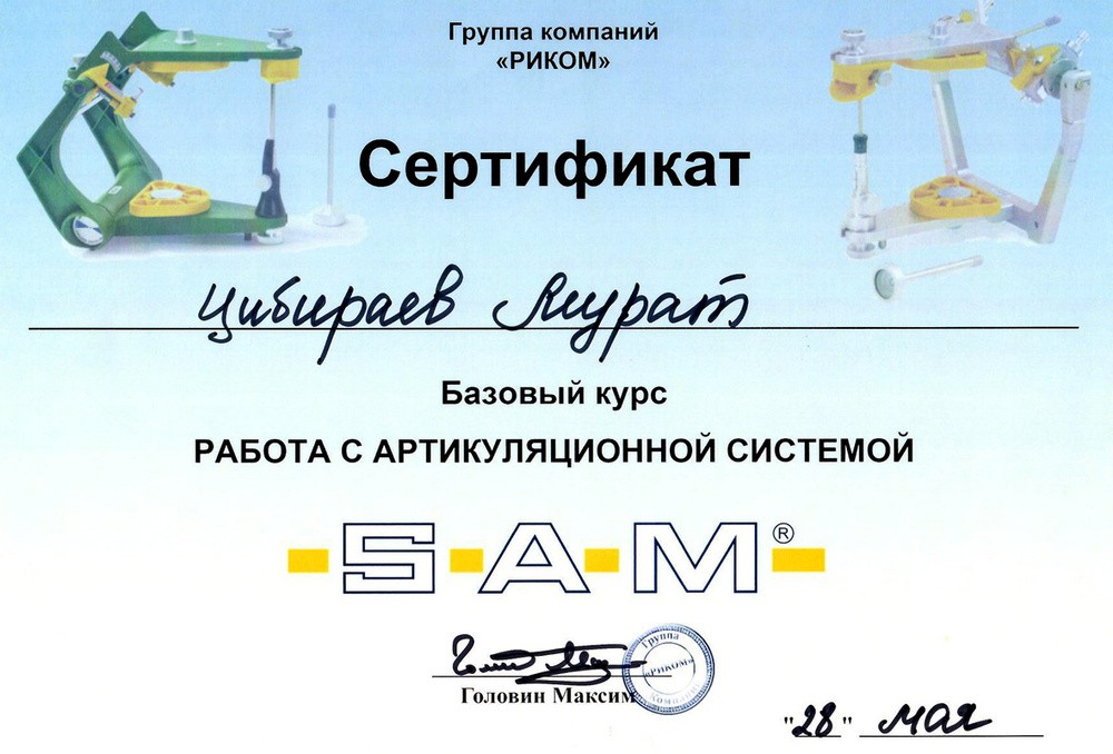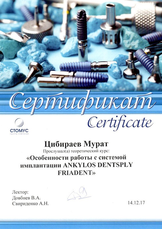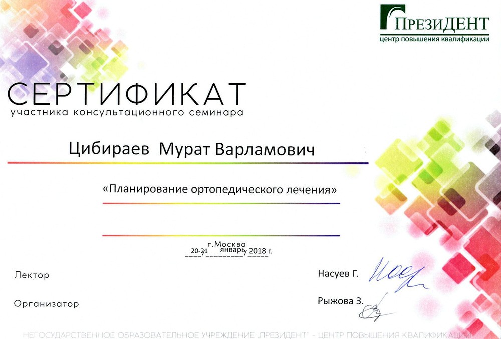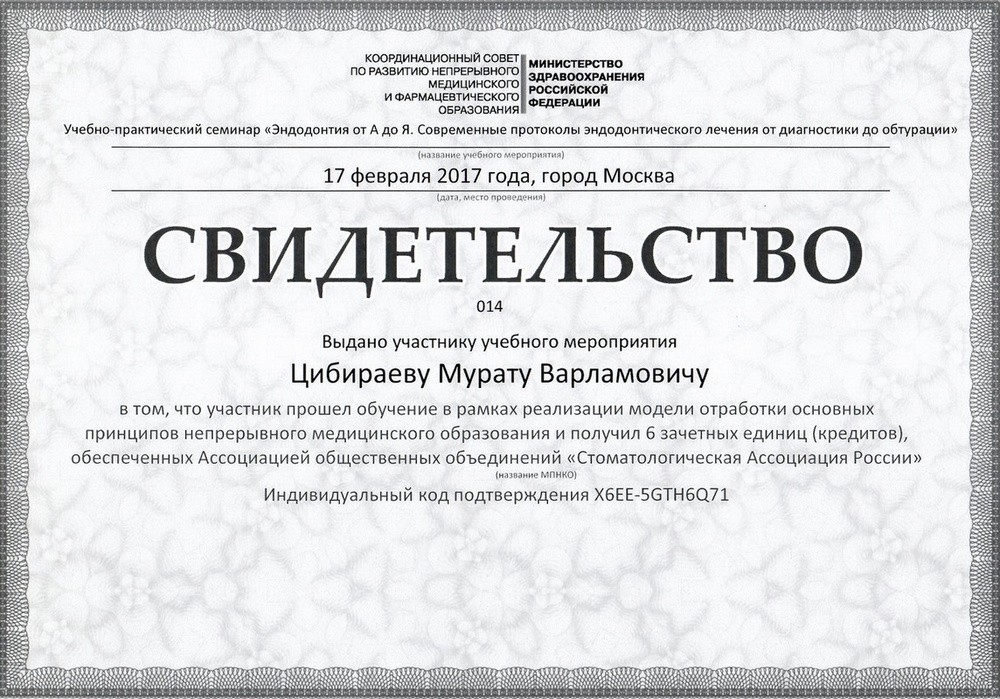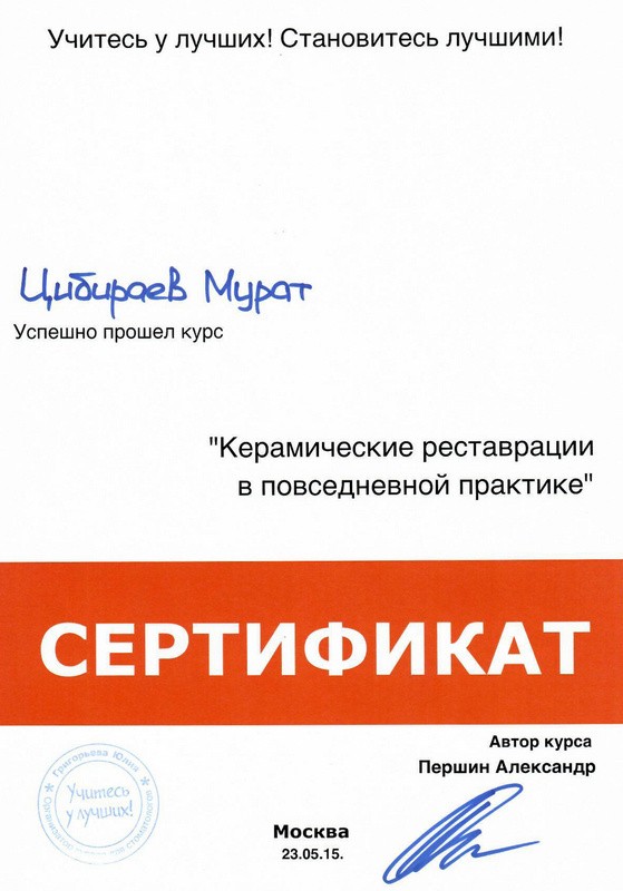 • 2016г. – Сертификат по специальности «Стоматология ортопедическая»