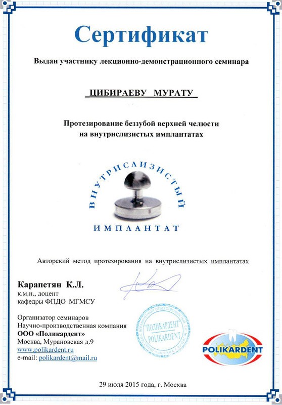 • 2015г. – «Протезирование беззубой верхней челюсти на внутрислизистых имплантатах»