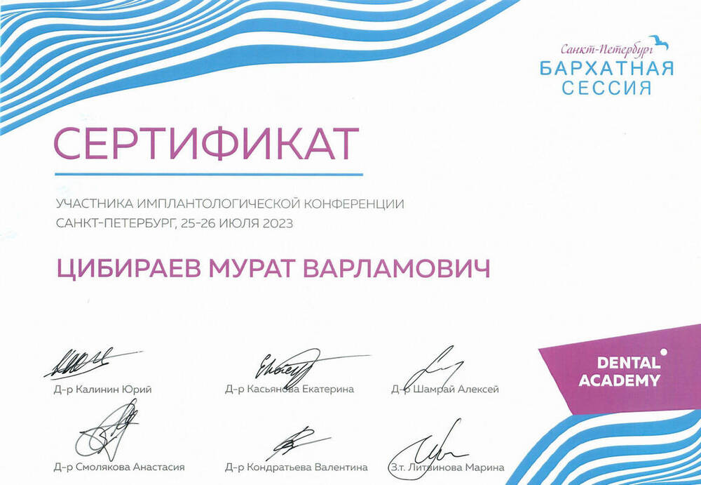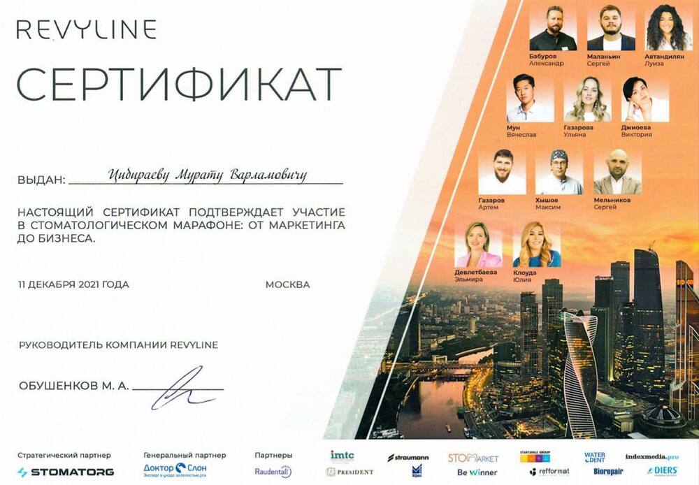 • 2020г. – Удостоверение о повышении квалификации по специальности «Стоматология ортопедическая»
