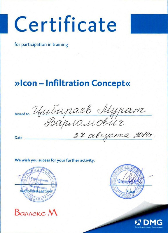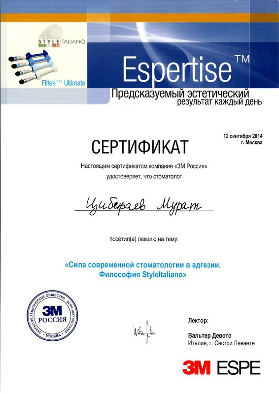 • 2014г. – Сертификат по специальности «Стоматология общей практики»