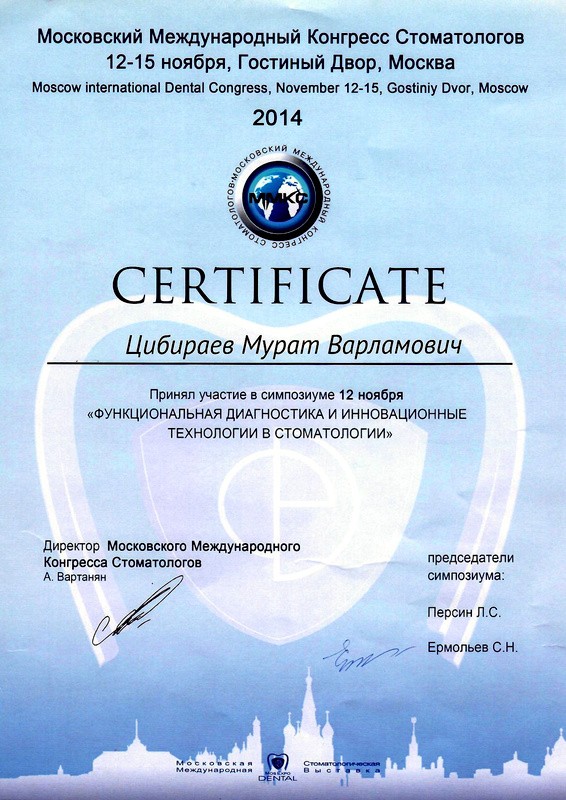 • 2014г. – Московский Международный Конгресс Стоматологов «Функциональная диагностика и инновационные технологии в стоматологии»
