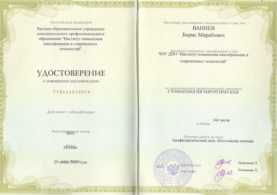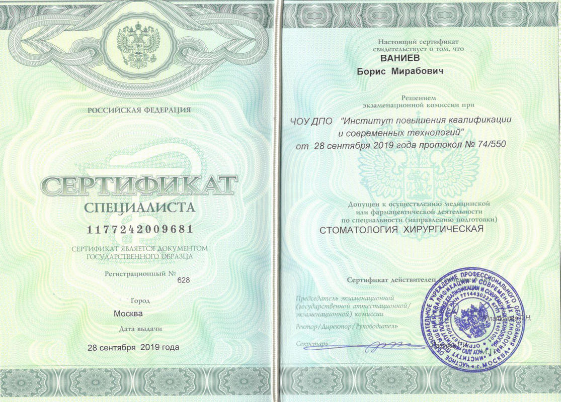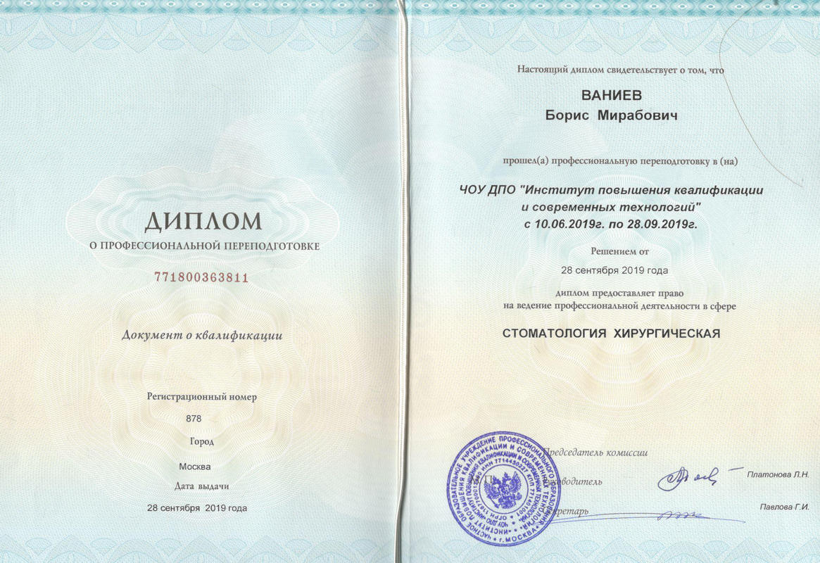 - Институт повышения квалификации и современных технологий2019Стоматология хирургическая2019