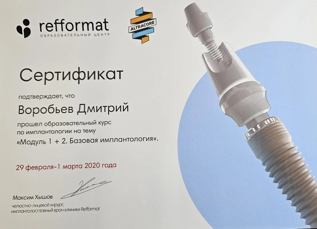 2020г. — Образовательный курс по имплантологии «Модуль 1+2. Базовая имплантология», Москва