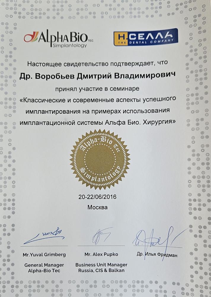 2016г. — Семинар «Классические и современные аспекты успешного имплантирования на примерах использования имплантационной системы Альфа Био. Хирургия» Илья Фридман, Москва